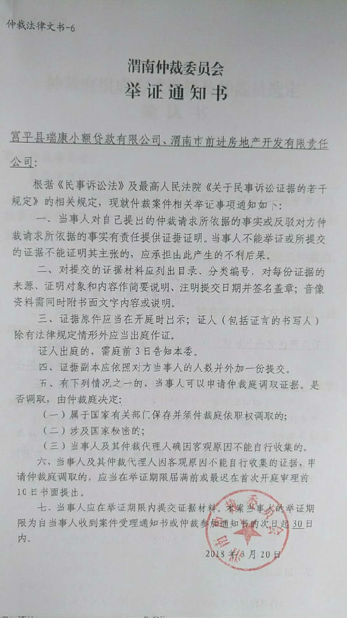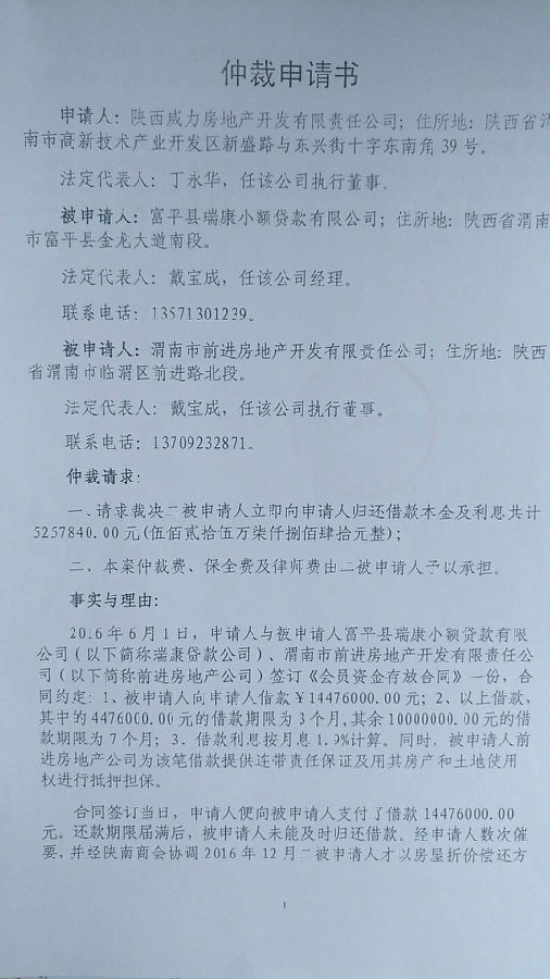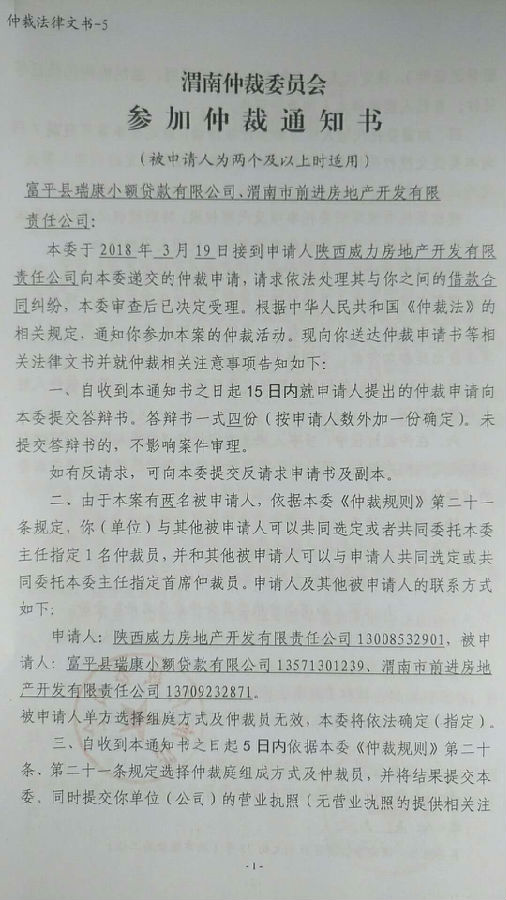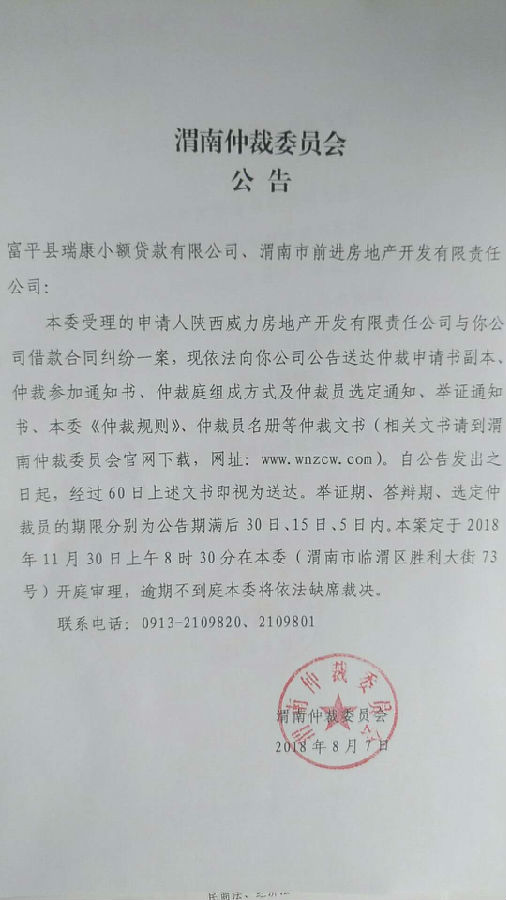陜西威力房地產(chǎn)開發(fā)有限責任公司與富平縣瑞康小額貸款有限公司、渭南市前進房地產(chǎn)開發(fā)有限責任公司一案公告