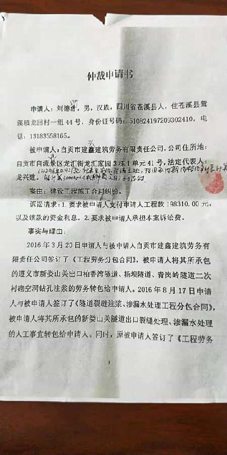 劉德財與自貢市建興建筑勞務(wù)有限責任公司一案公告