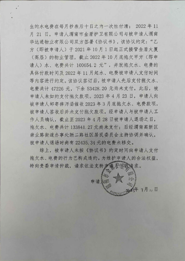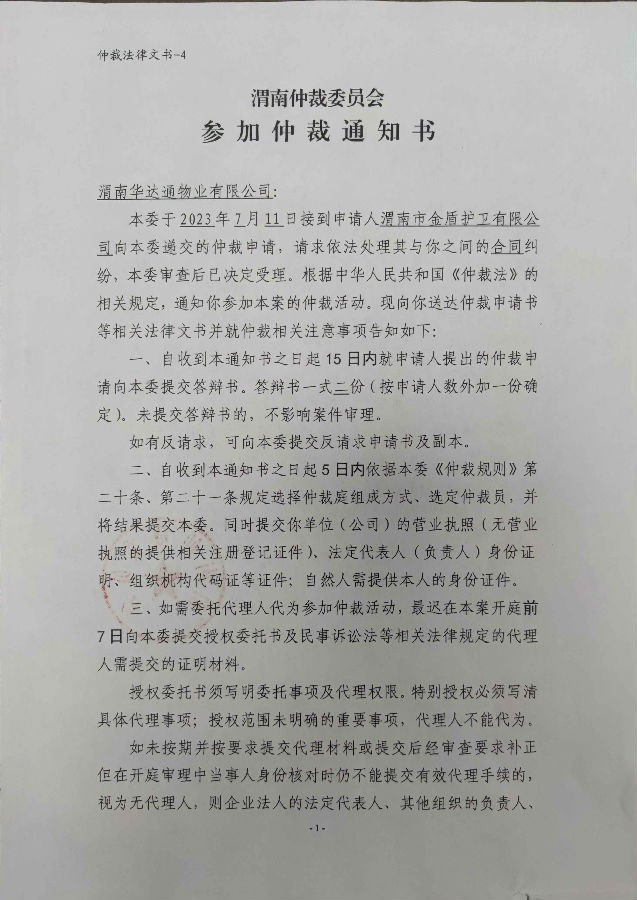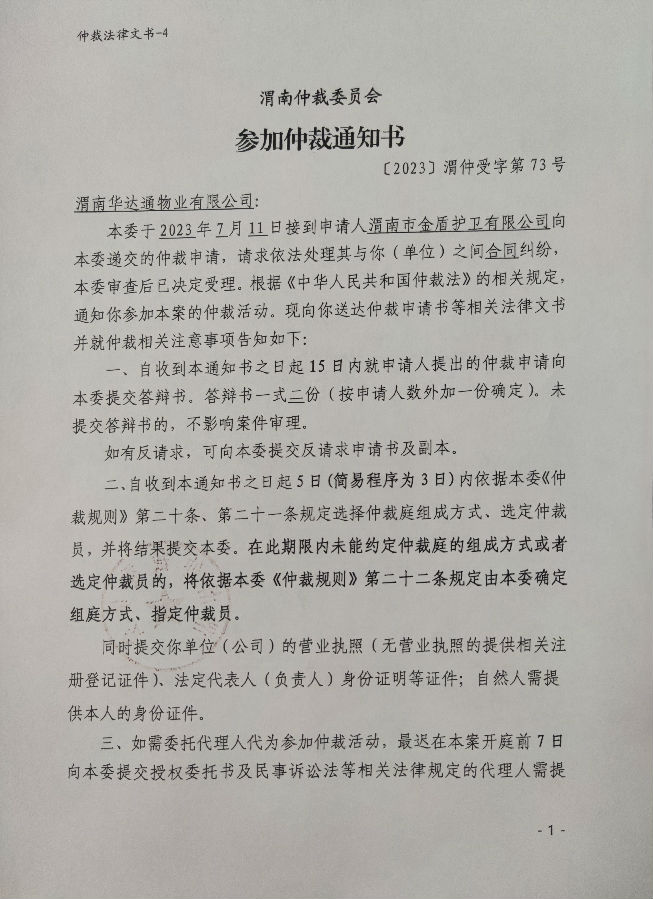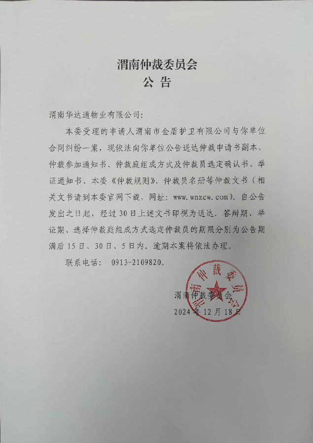渭南市金盾護衛(wèi)有限公司與渭南華達通物業(yè)有限公司合同糾紛案公告