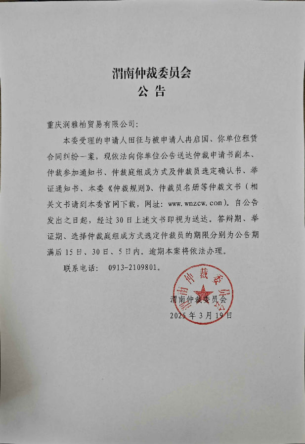 重慶潤(rùn)雅柏貿(mào)易有限公司、冉啟國(guó)與田征租賃合同糾紛案公告