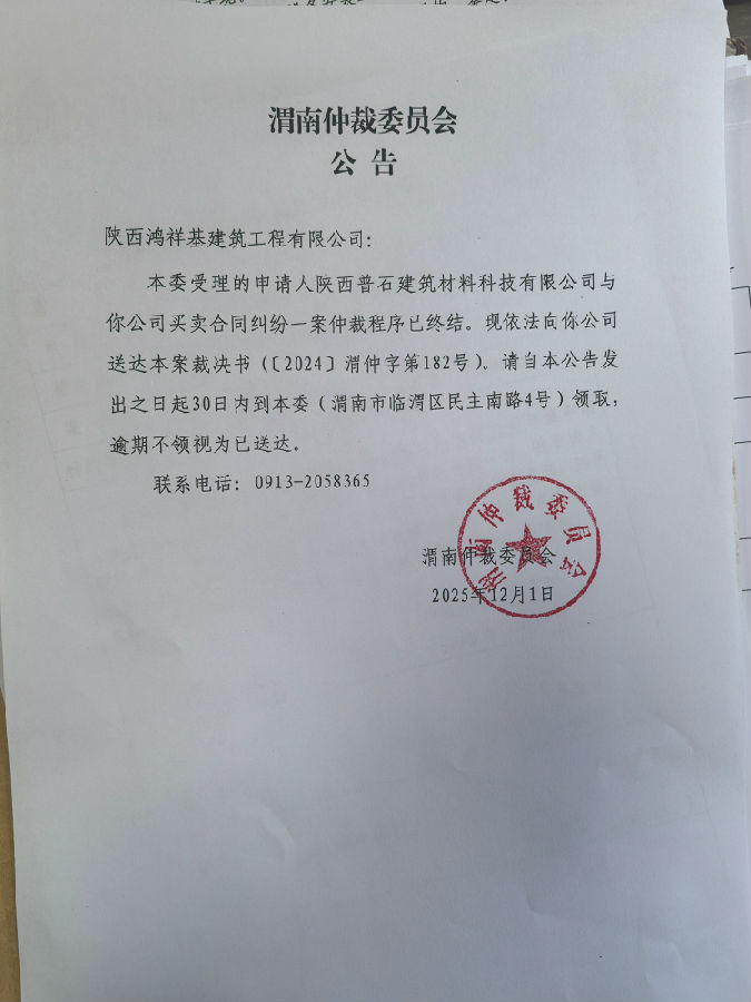 陜西普石建筑材料科技有限公司與陜西鴻祥基建筑工程有限公司之間買(mǎi)賣(mài)合同一案公告
